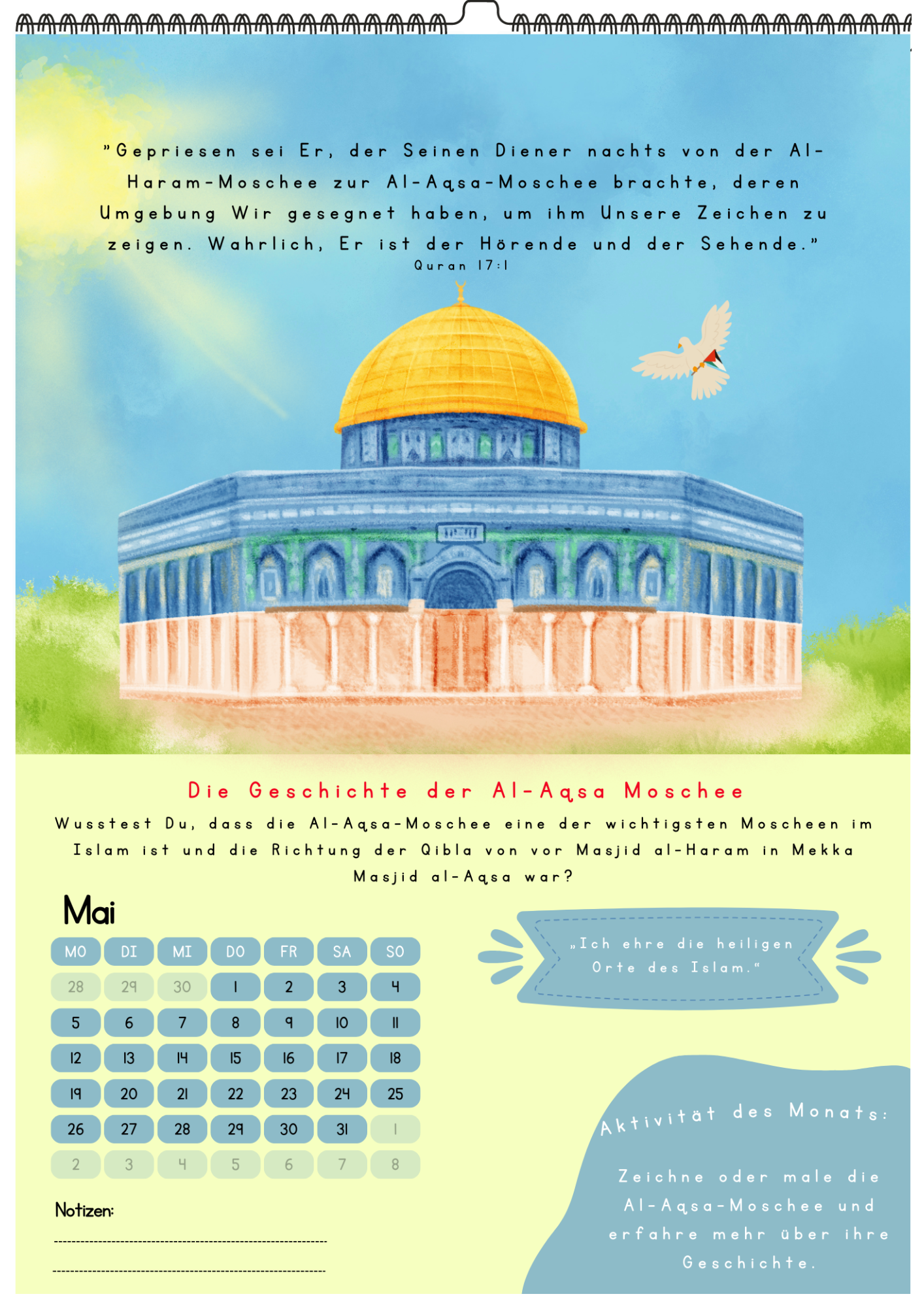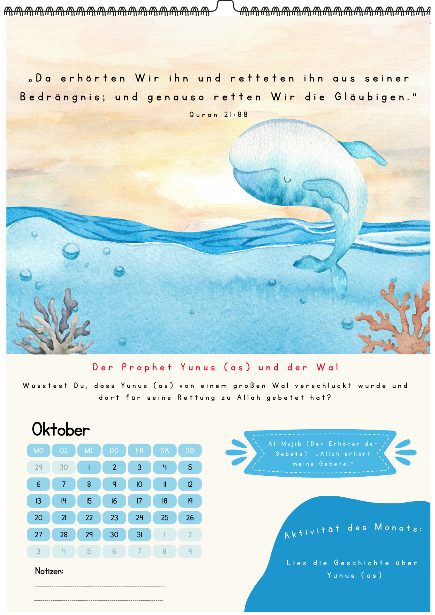 Tauche mit deinem Kind in die wundervolle Welt der Propheten ein – Monat für Monat! Unser islamischer Kinderkalender 2025 ist speziell dafür gestaltet, Kinder spielerisch und inspirierend an das Leben der Propheten heranzuführen. Jeder Monat widmet sich einem Propheten und bietet eine kindgerechte Einführung in seine Geschichte, begleitet von einer Affirmation, einer Quran-Ayat und einer spannenden Aufgabe.