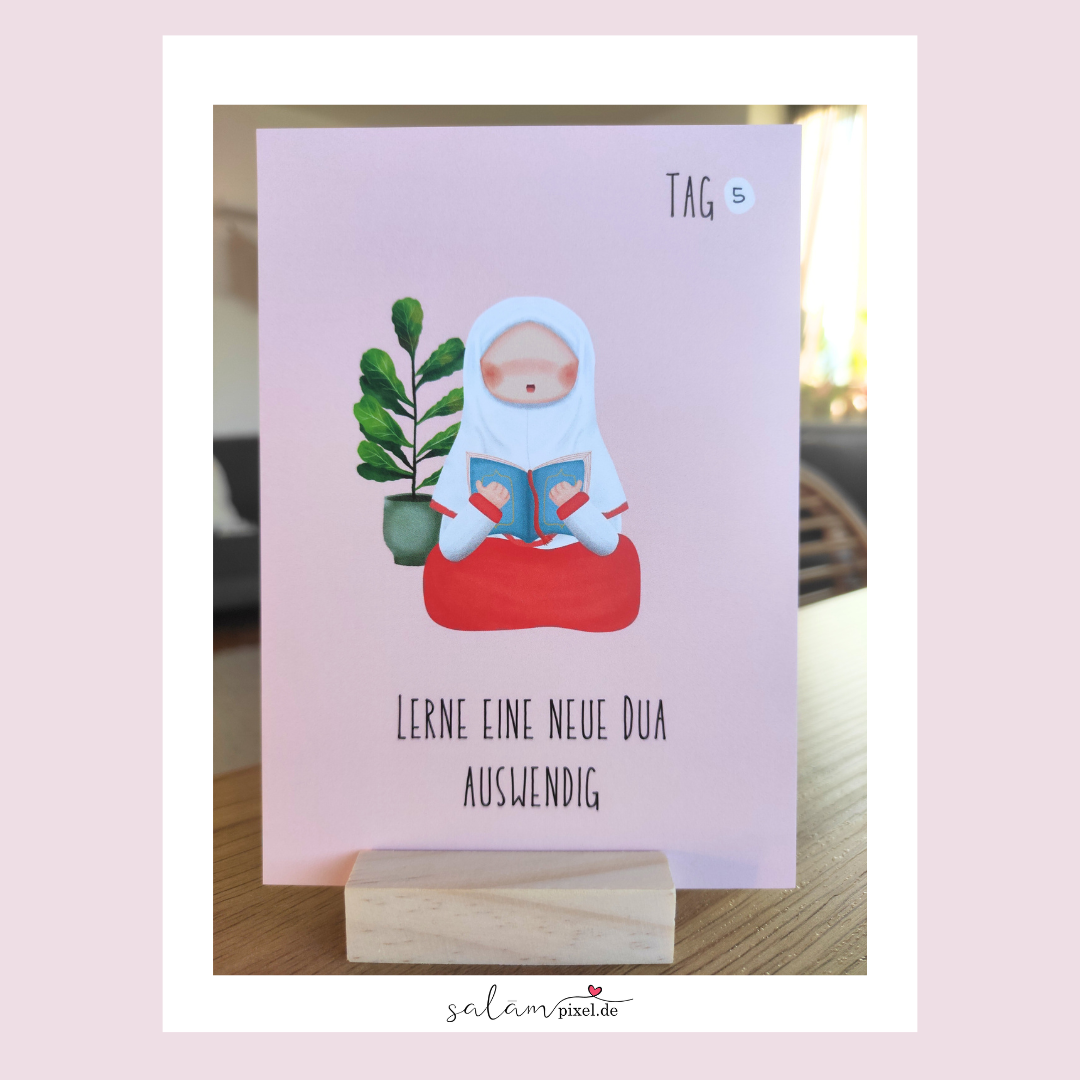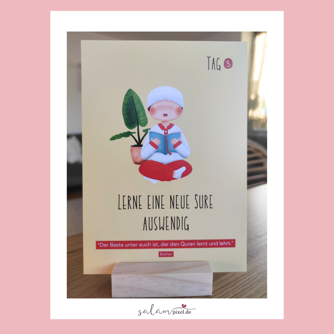 Der Holzaufsteller für die Ramadan-Karten bietet eine elegante Präsentation, während er gleichzeitig das tägliche Lernen und Praktizieren vor Augen führt.