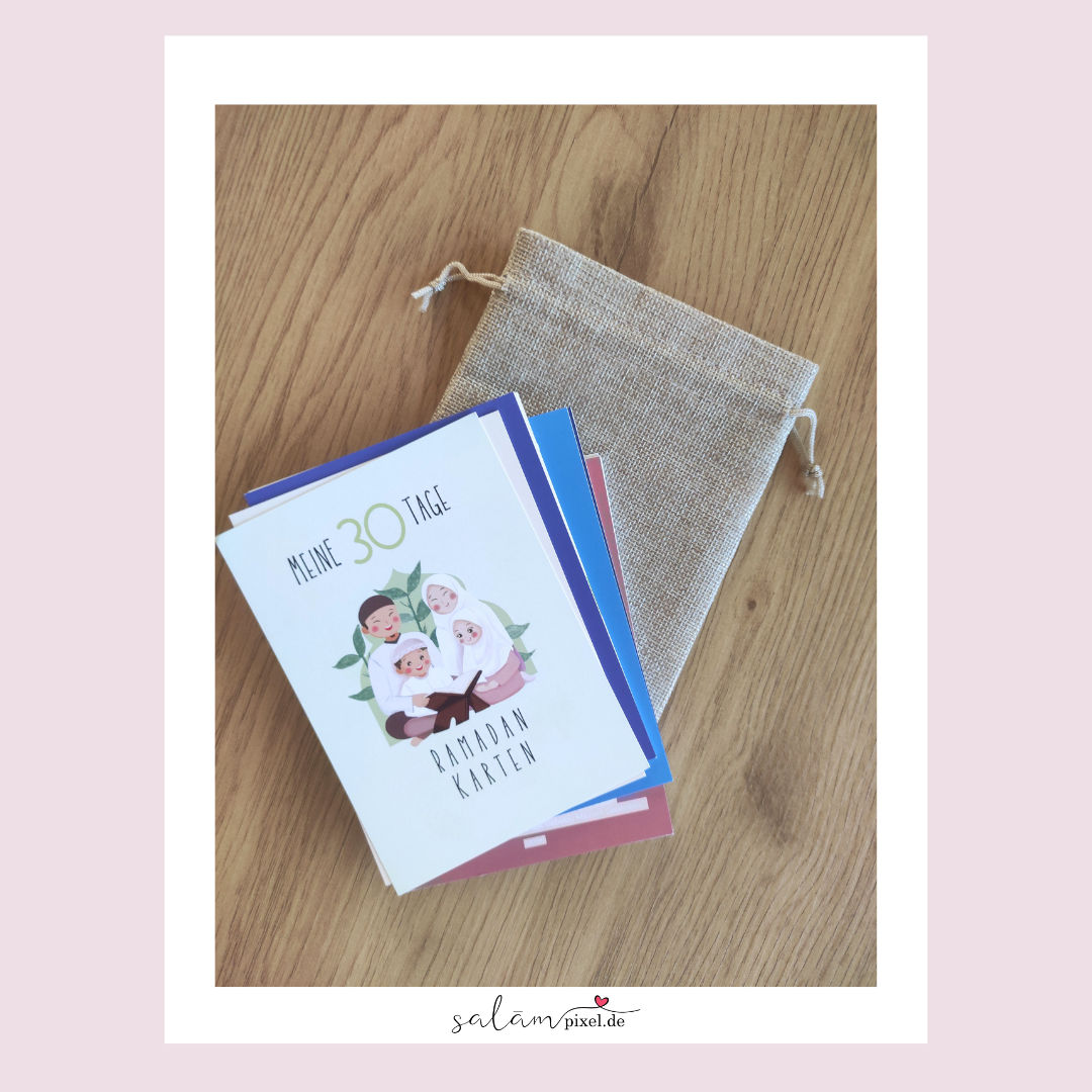 - 30 liebevoll gestaltete Ramadan-Karten, verpackt in einem Leinenbeutel (Format A6).