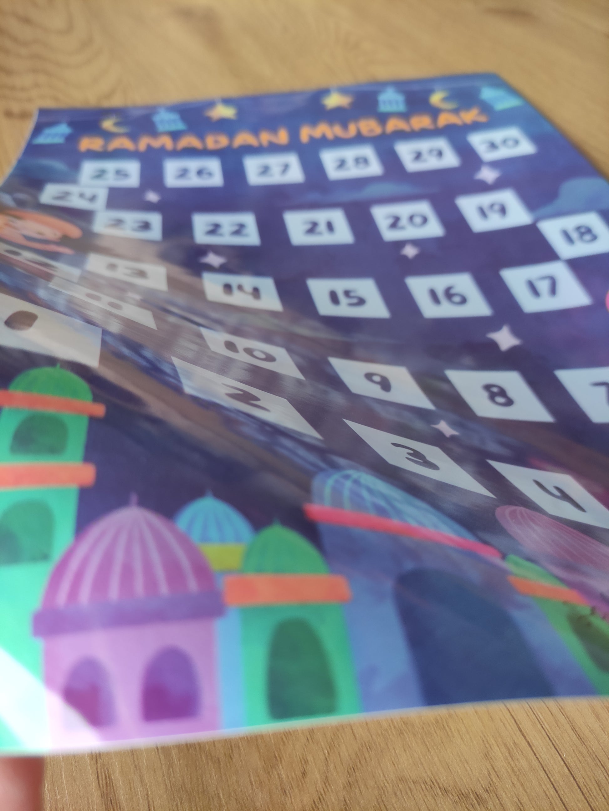 Das DIN A3 große "Ramadan Eid Countdown"-Poster auf deutsch versüßt die Wartezeit bis zum Festtag, indem es die Tage bis zum Ramadan Eid zählt und die Vorfreude unter den Kindern spielerisch steigert. Beginnend mit dem ersten Tag des Ramadan, können die Kinder täglich mit einem abwischbaren Folienstift die vergangenen Tag durchstreichen.