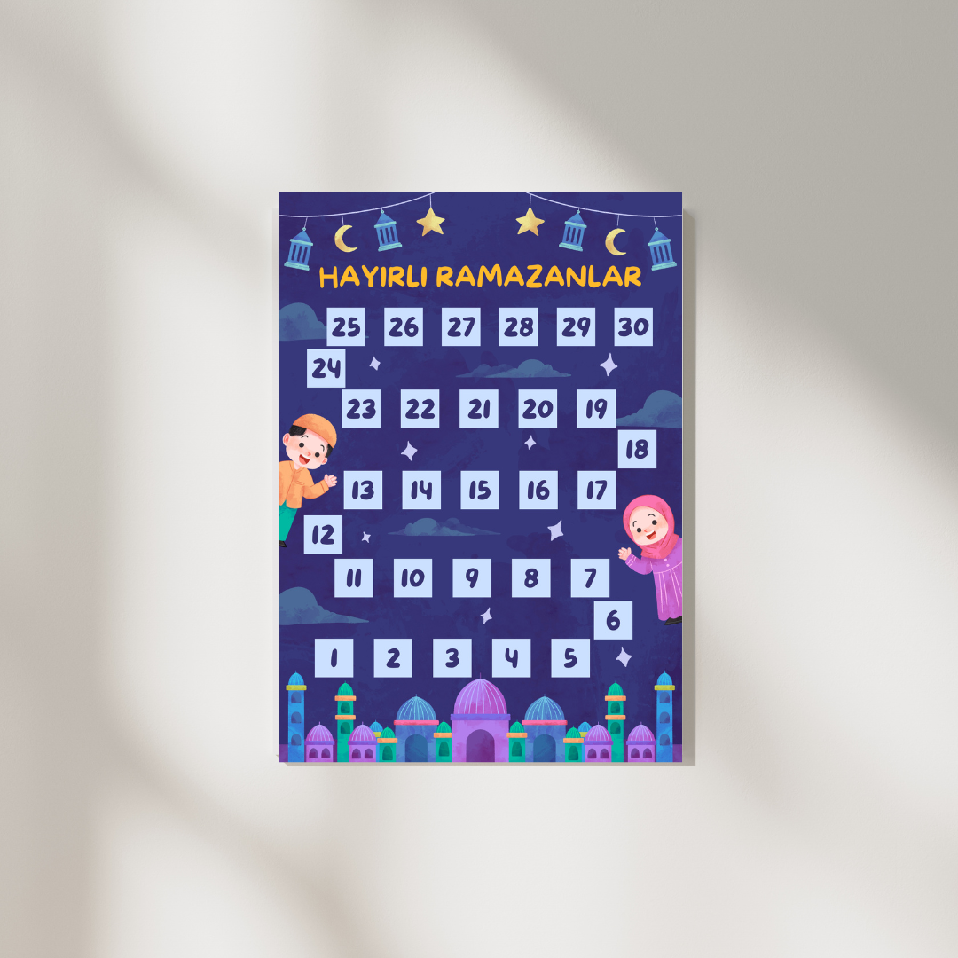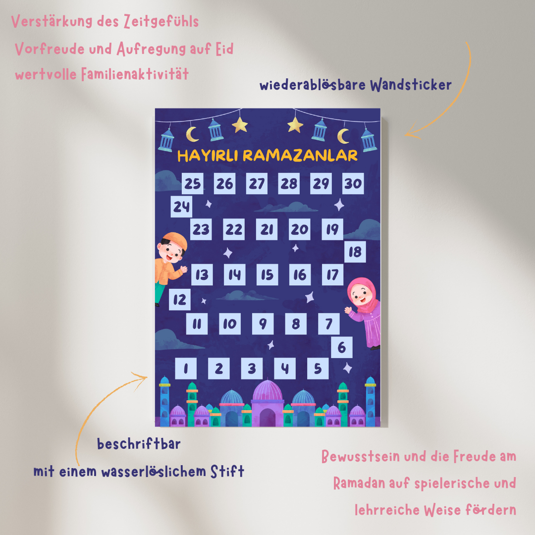 Das DIN A3 große "Ramadan Eid Countdown"-Poster auf türkisch versüßt die Wartezeit bis zum Festtag, indem es die Tage bis zum Ramadan Eid zählt und die Vorfreude unter den Kindern spielerisch steigert. Beginnend mit dem ersten Tag des Ramadan, können die Kinder täglich mit einem abwischbaren Folienstift die vergangenen Tag durchstreichen.